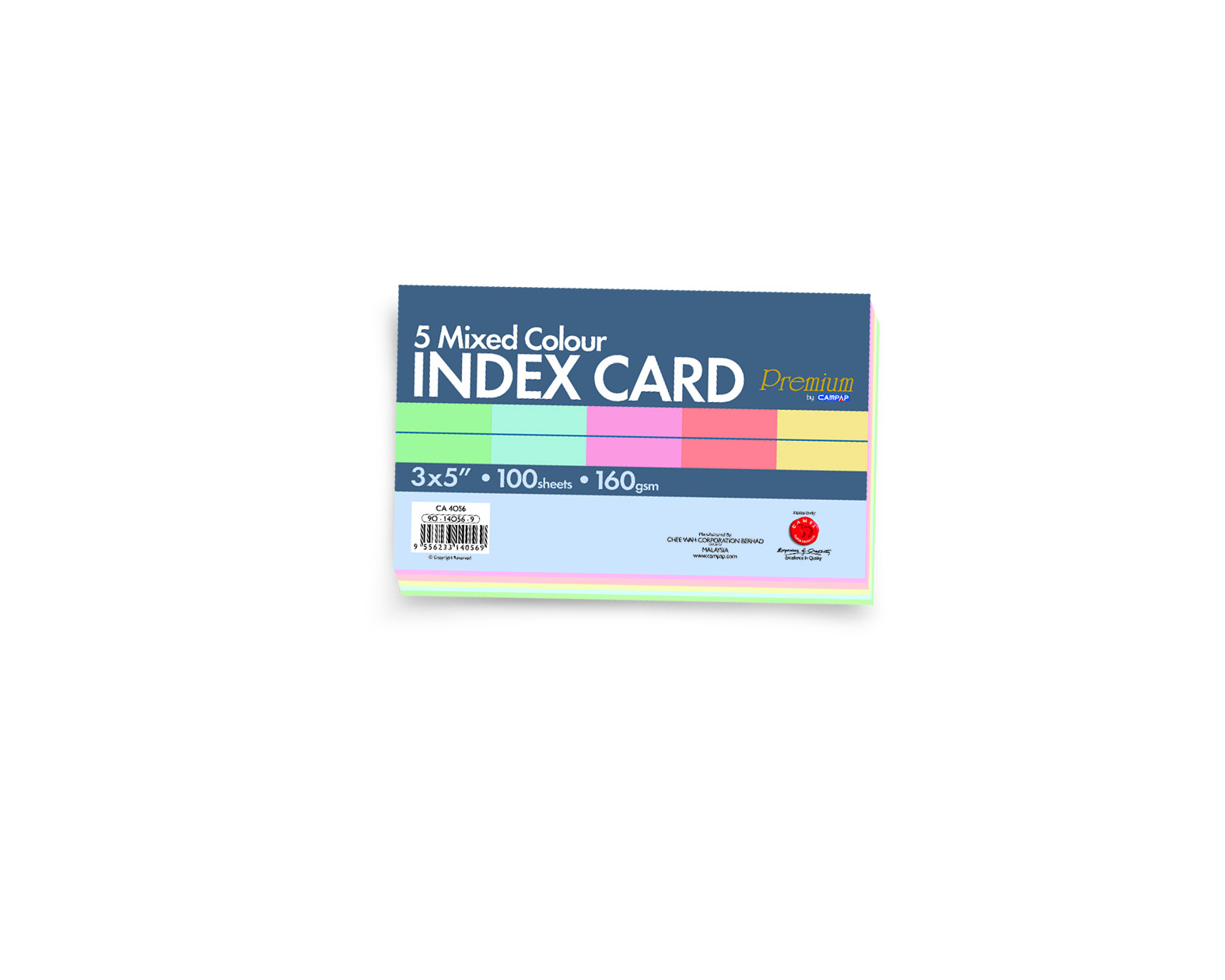CAMPAP PREMIUM INDEX CARDS, 5 MIXED COLORS, 2 SIDE RULED, 160GSM, 3x5", 100S