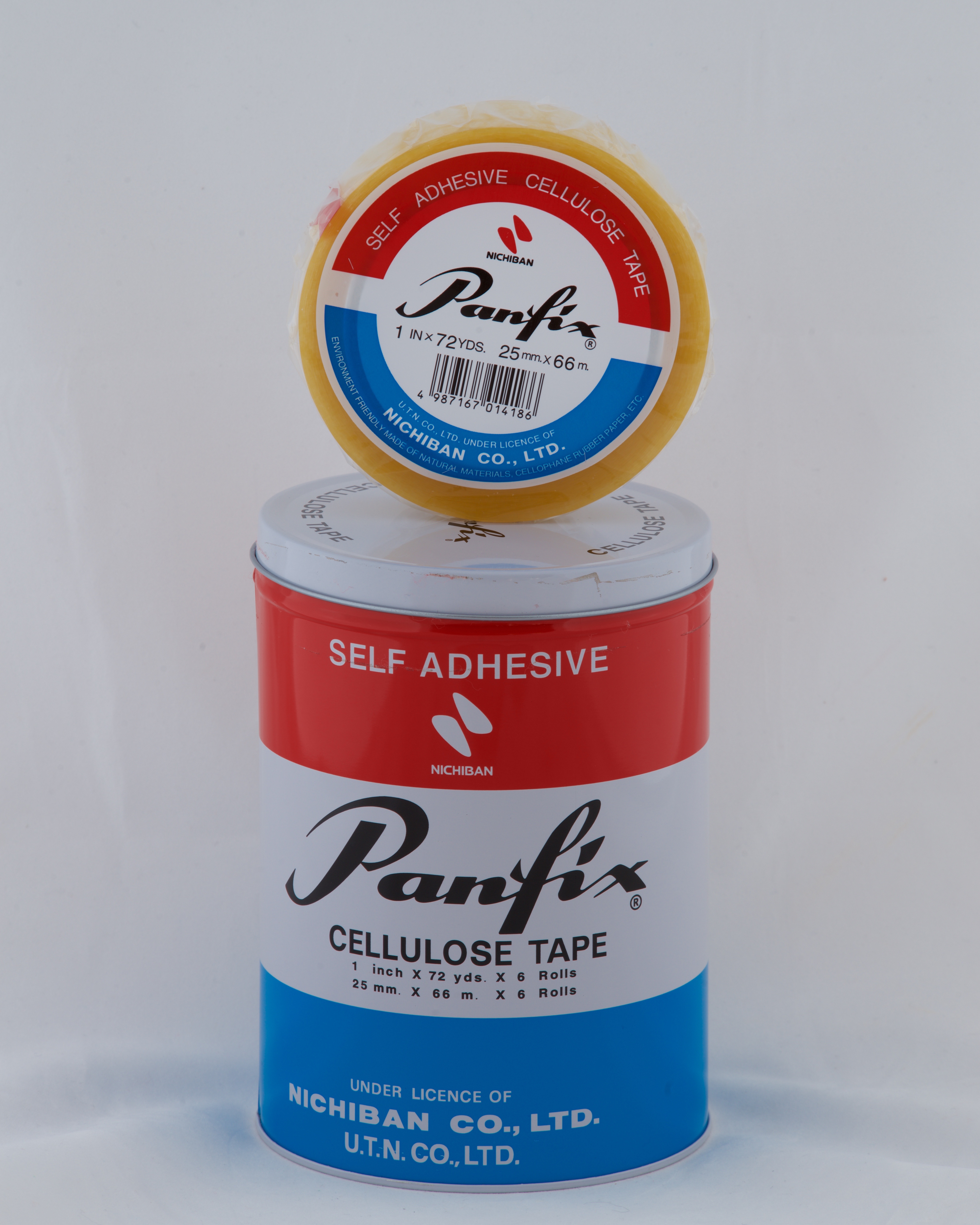 NICHIBAN PANFIX CELLULOSE TAPE CAN OF 6 ROLLS, ECO-FRIENDLY, 25mm X 66m