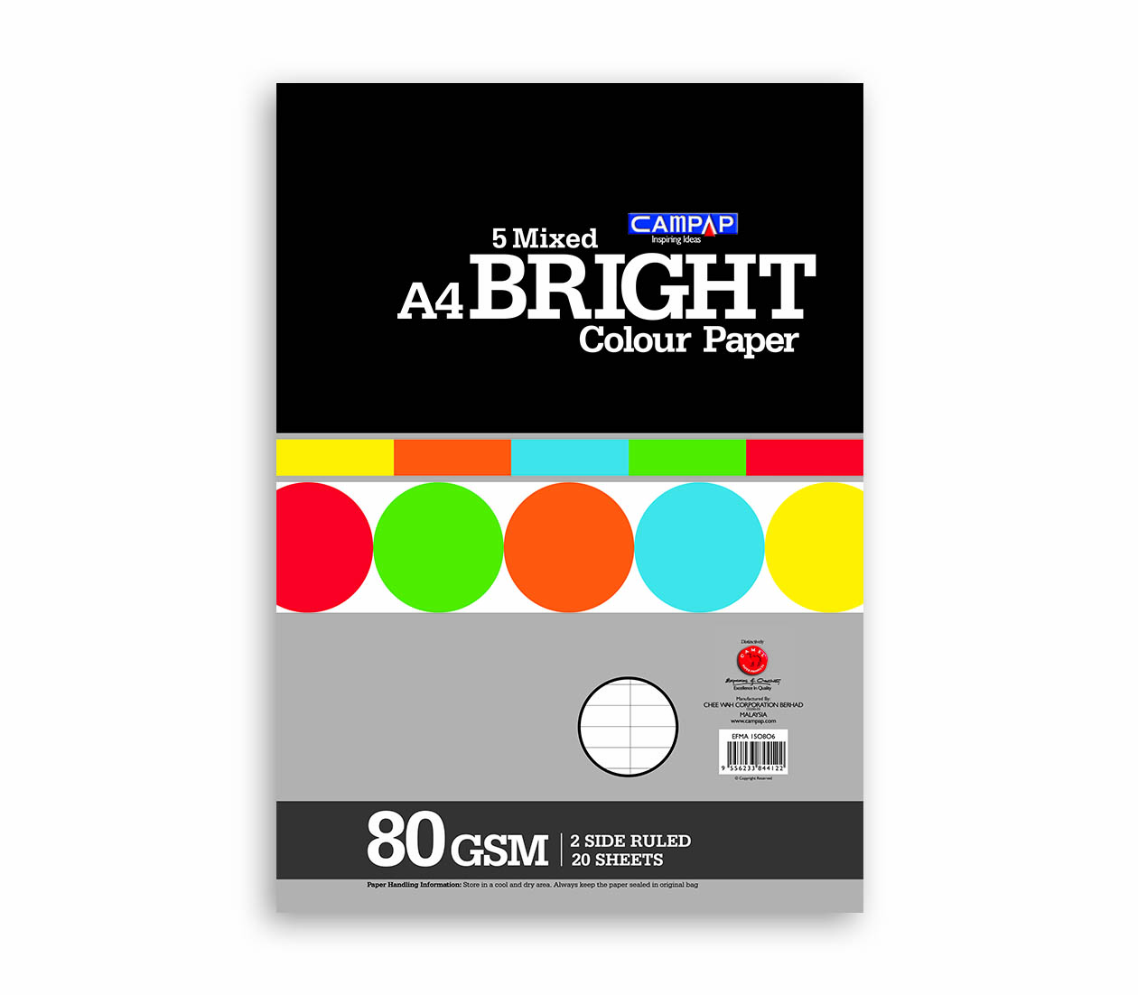CAMPAP PREMIUM PAPER PACK, 5 MIXED BRIGHT COLORS, 2-SIDE RULED, 80GSM, A4, 20S