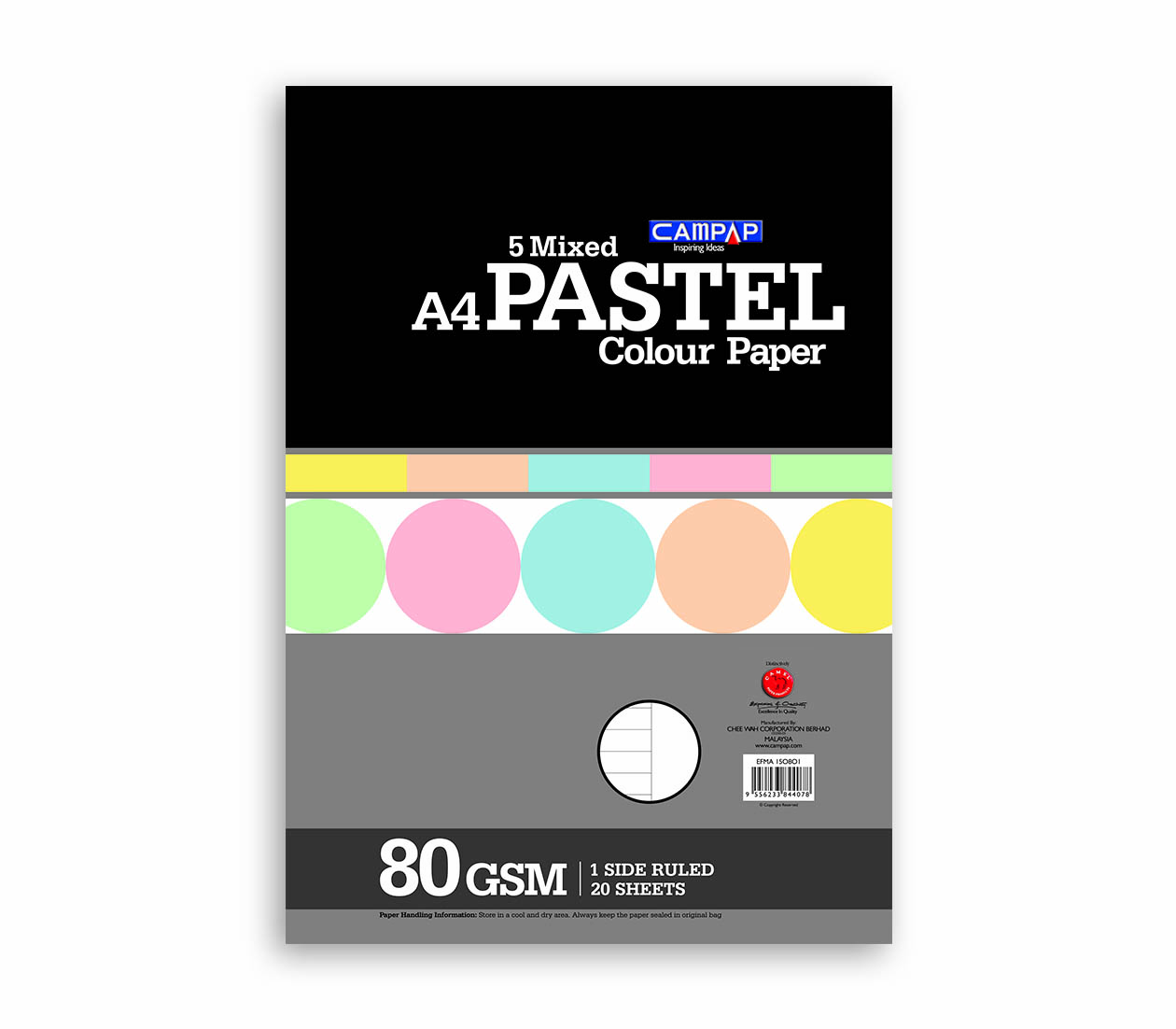 CAMPAP PREMIUM PAPER PACK, 5 MIXED PASTEL COLORS, 1-SIDE RULED, 80GSM, A4, 20S