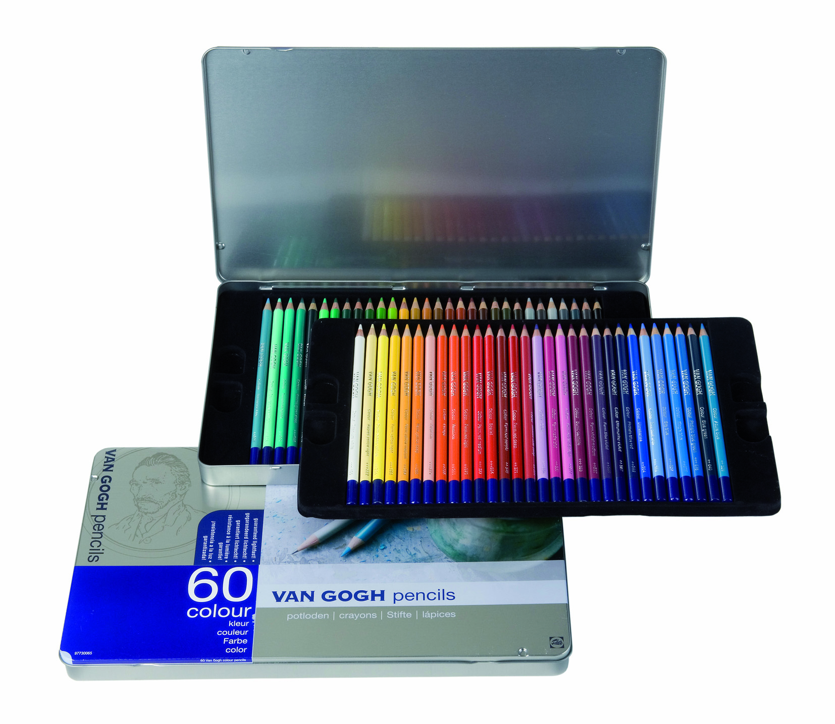 Behold the beauty of splendid colours in pencil format! Van Gogh artist pencils are uniquely formulated with lightfast pigments. The barrels are made from responsibly forested cedar wood; a soft wood that is easy to sharpen. Experience the intense colours with easy laydown and transfer. This 60-piece tin set of coloured pencils includes the complete colour range: Titanium White (105), Naples Yellow Light (222), Permanent Lemon Yellow (254), Permanent Yellow Light (283), Permanent Yellow Medium (284), Permanent Yellow Deep (285), Flesh Tint (374), Orange (235), Vermillion (311), Permanent Red Light (370), Permanent Red Medium (377), Scarlet (334), Permanent Red Purple (348), Permanent Red Deep (371), Madder Lake Deep (331), Lilac (556), Permanent Red Violet (567), Permanent Red Violet Light (577), Burnt Carmine (323), Permanent Violet Medium (537), Permanent Blue Violet (568), Ultramarine Violet (507), Phthalo Blue Red (583), Ultramarine (504), Sky Blue Light (551), Sky Blue (527), King's Blue (517), Phthalo Blue Green (576), Bluish Green (640), Azure Blue (526), Turquoise Blue (522), Sevres Green Light (658), Turquoise Green (661), Sevres Green Deep (659), Viridian (616), Emerald Green (615), Phthalo Green Light (673), Phthalo Green Deep (674), Permanent Green Deep (619), Permanent Green Medium (614), Permanent Green Light (618), Permanent Yellowish Green (633), Yellow Ochre Light (228), Yellow Ochre (227), Gold Ochre (231), Raw Sienna (234), Burnt Sienna (411), Light Oxide Red (339), Indian Red (347), Caput Mortuum Red (343), Greenish Umber (410), Olive Green (620), Vandyke Brown (403), Warm Grey Light (728), Warm Grey Deep (729), Cold Grey Light (738), Cold Grey Light (738), Bluish Grey (727), Payne's Grey (708), Ivory Black (701).